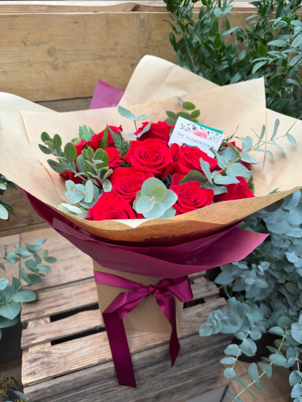 A bouquet of 12 red freedom roses, the perfect gift, complimented with mixed foliages, handtied and wrapped in a aqua pack and presented in a Gift Box finished with a large Bow