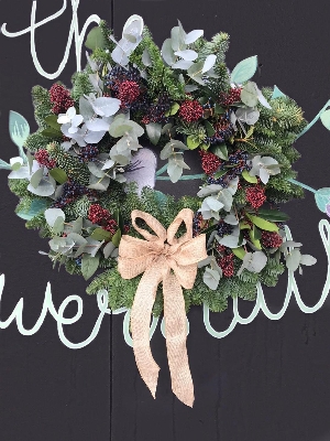 A beautiful natural door wreath consisting of fresh pine, mixed eucalyptus, seasonal foliage and berries finished off with a big hessian bow.
