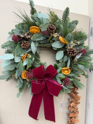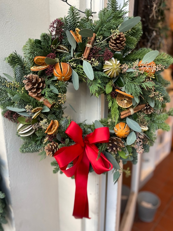A traditional fresh Christmas door wreath consisting of fresh pine and seasonal foliage decorated with festive dried fruits and materials including orange slices, pine cones, lotus heads and cinnamon sticks then finished off with a classic Red bow.
