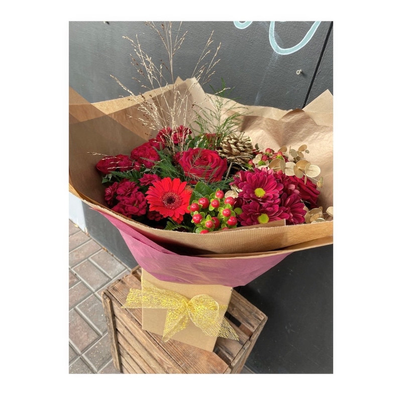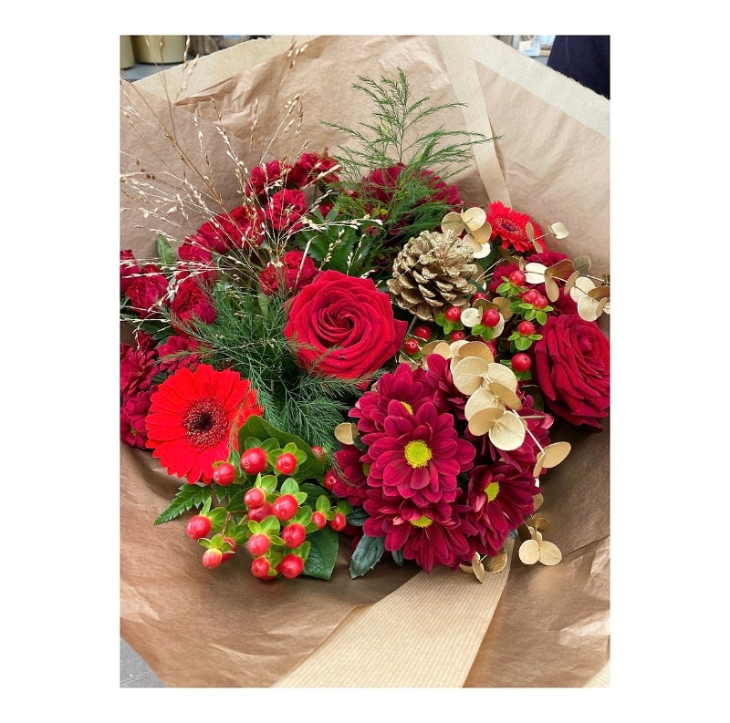A Stunning traditional Christmas bouquet, with a seasonal mix of red and green flowers and foliage with accents of gold foliage and/ or decor.
