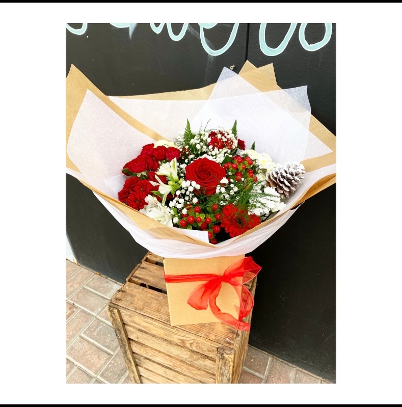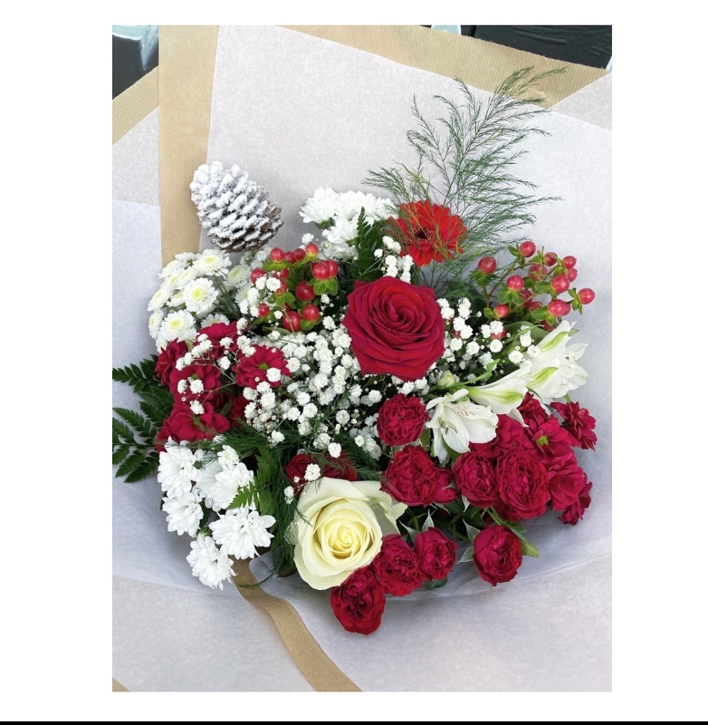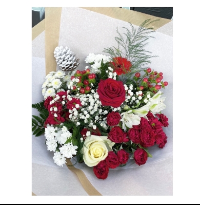 A Beautiful Christmas bouquet created with seasonal white and red flowers and mixed Christmas foliage.